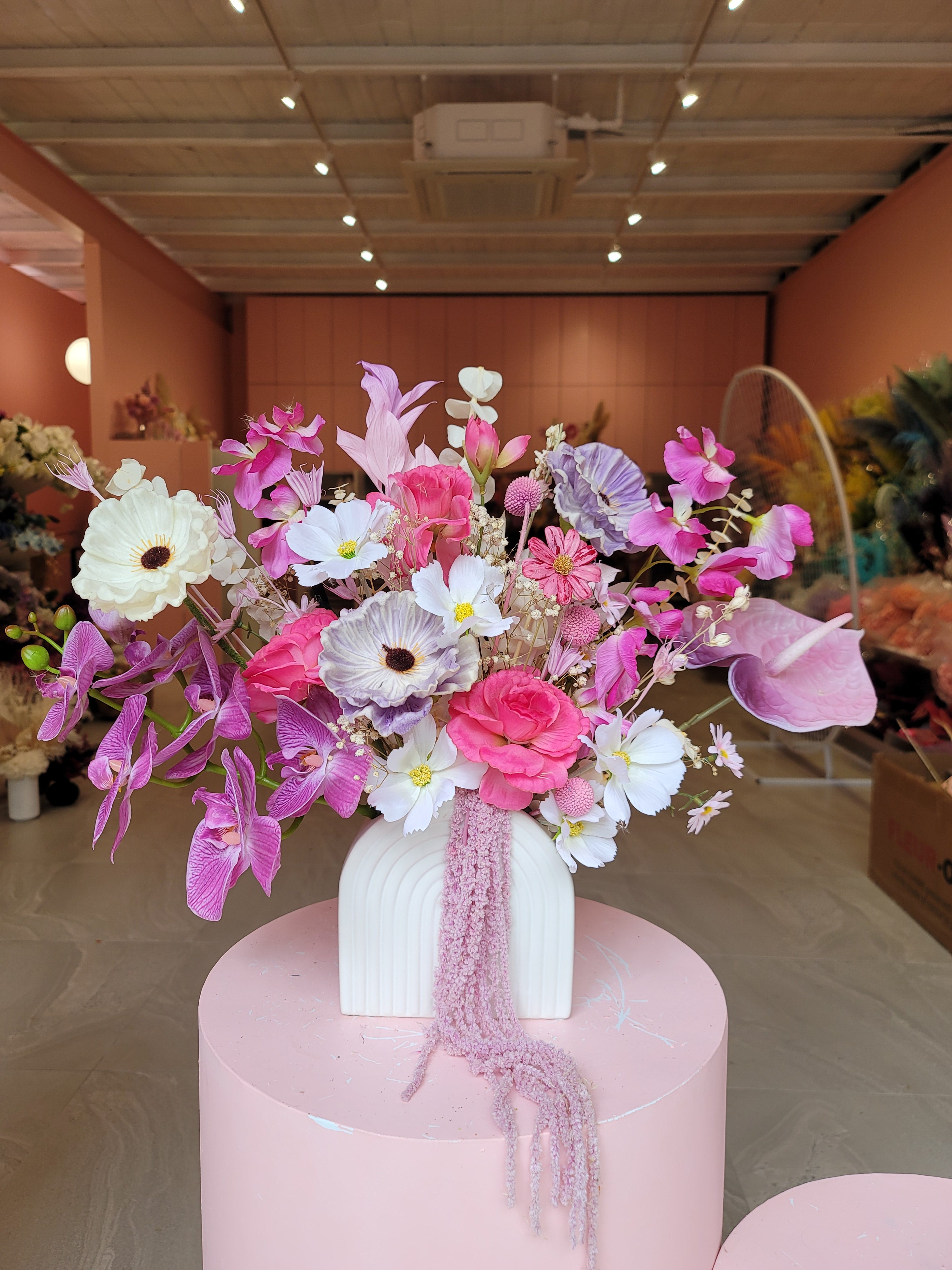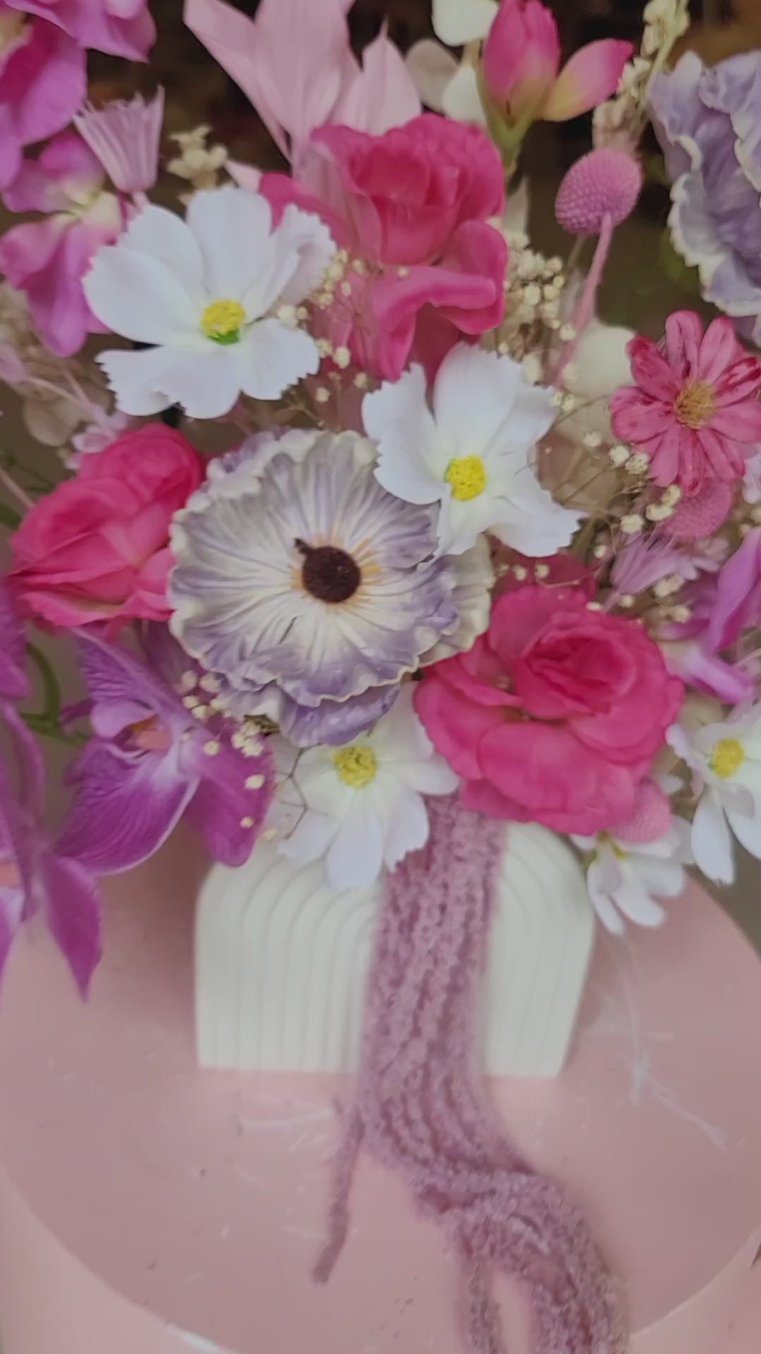 White pot with pink, purple & white artificial silk flowers with preserved Amaranthus.